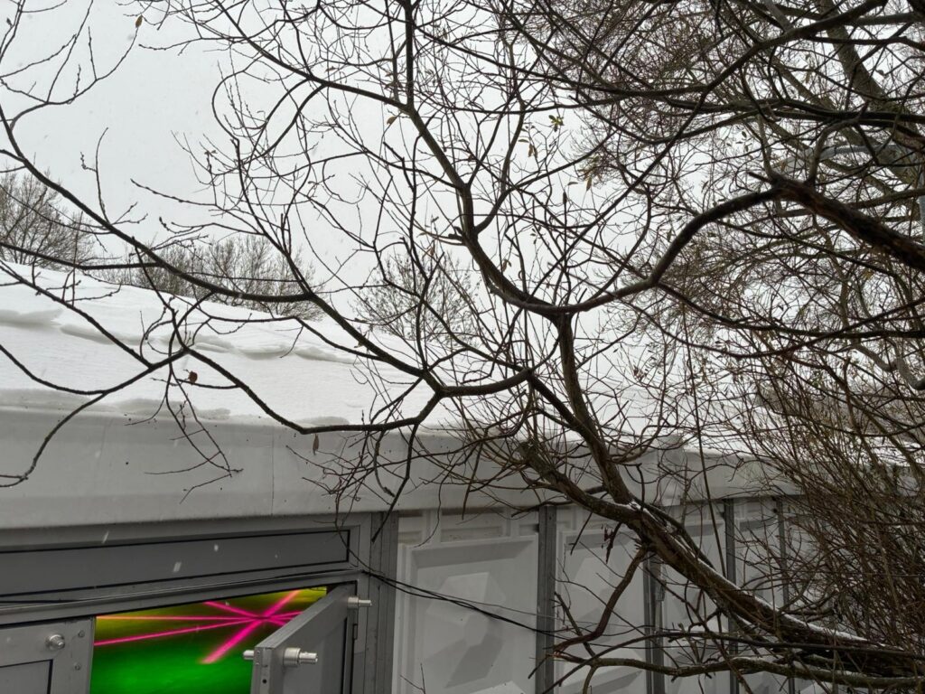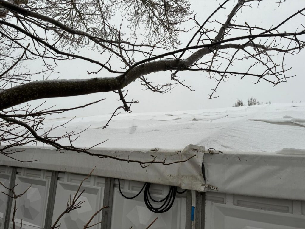 Nederhorst werd begin januari behoorlijk onder gesneeuwd, en die sneeuw besloot ook in grote getale op het tentdoek van de overdekte ijsbaan te blijven liggen. Als vrijwilligers onder elkaar hebben wij een aantal keren geholpen de tent weer sneeuw vrij te maken in de eerste dagen van Januari.